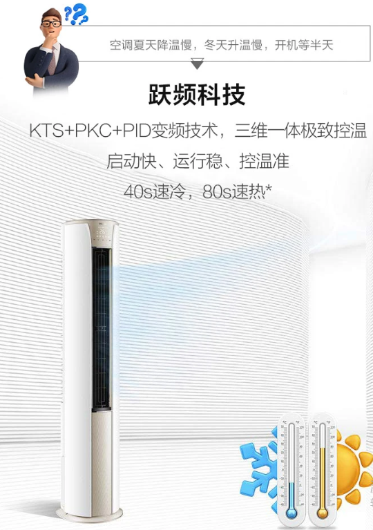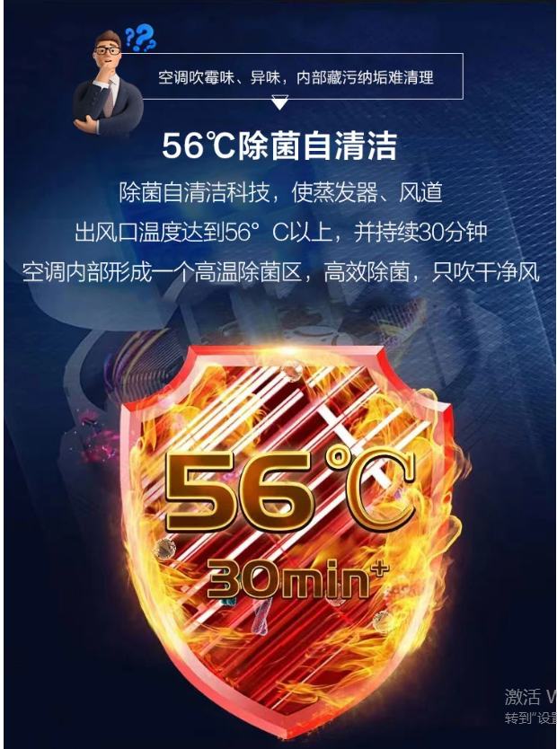 空調(diào)夏天降溫慢,冬天升溫慢,開(kāi)機(jī)等半天,這款靜悅空調(diào)采用KST+PKC+PID變頻技術(shù),三維一體極致控溫,啟動(dòng)快、運(yùn)行穩(wěn)、控溫準(zhǔn),40S速冷,80S速熱。搭配強(qiáng)勁壓縮機(jī),強(qiáng)勁動(dòng)力,速冷速熱。還帶有56℃除菌自清潔功能,出風(fēng)口溫度達(dá)到56℃以上,并持續(xù)30分鐘,空調(diào)內(nèi)部形成一個(gè)高溫除菌區(qū),高效除菌,只吹干凈風(fēng)。次空調(diào)采用上下分段式豎百葉,可根據(jù)用戶需求獨(dú)立控制,采用專利導(dǎo)風(fēng)板應(yīng)用高爾夫球面導(dǎo)流科技,20個(gè)大波浪導(dǎo)板,1800個(gè)高爾夫球面,分散氣流,送風(fēng)更舒適。?